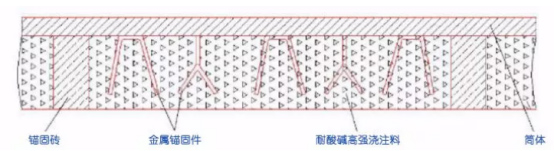 采用上述澆注料在回轉(zhuǎn)窯筒體的內(nèi)表面上澆注厚度不低于250mm。內(nèi)襯包括多塊呈軸向均勻分布固定于筒體內(nèi)表面的酸性或中性錨固磚,錨固磚兩側(cè)的筒體內(nèi)表面固定有多個均勻分布的金屬錨固件,再用耐酸堿高溫澆注料,該耐酸高強(qiáng)澆注料通過錨固磚和金屬錨固件與筒體連接為一體。局部內(nèi)襯結(jié)構(gòu)如圖1所示。